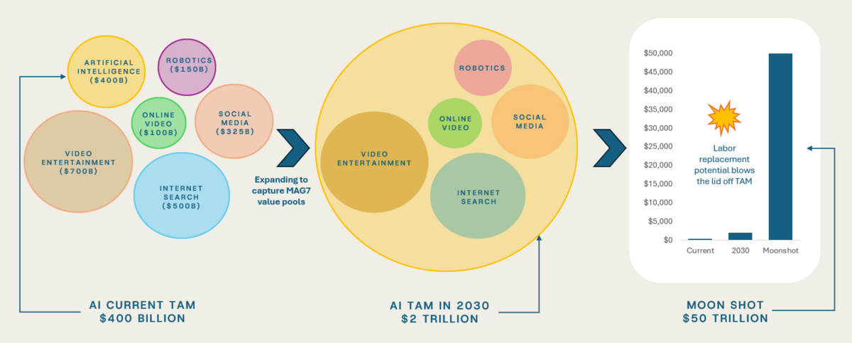 The current total addressable market (TAM) represents a subsegment of the digital marketplace for information and analysis. We anticipate that AI capabilities will quickly expand to overlap with much of the profit pools where current MAG7 companies dominate (search, video, robotics, social media). The moonshot is if AI begins targeting human and intellectual capital — representing roughly 40% of the global economy, or about $125 trillion. In our graph above, we further segment this moonshot TAM to professional services at an estimated size of $50 trillion.